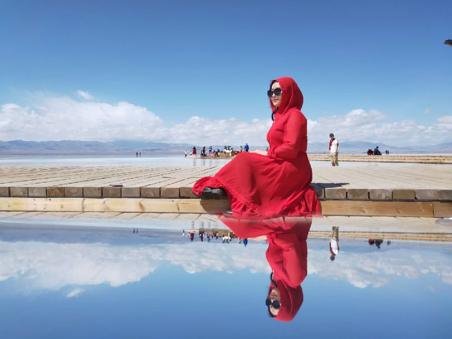 12号清早,大家前往大西北最后一站-茶卡盐湖,沿途成群的绵羊和牦牛,为这个广阔的天地增添了几分生趣,蓝天下白云低垂的仿佛一伸手就可以摘一朵,经过漫长的车程终于抵达了赋有天空之镜美名的茶卡盐湖,到处都是雪白色的盐,让人误以为进了冰雪之地,穿上一袭红裙,伫立在洁净的盐湖,你就是最靓的风景线。