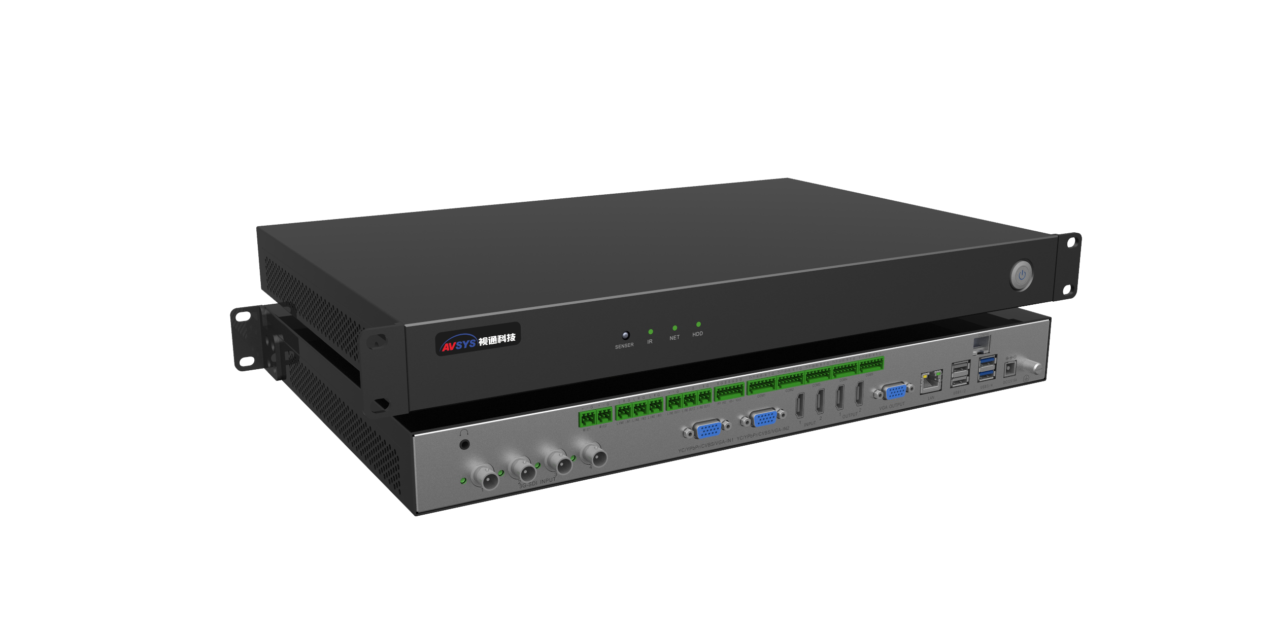 主机以ALL-IN-ONE的设计理念,集AVCRTM六合一:将音频处理器A、视频无缝混矩V、可编程中控C、录播编解码R、视频会议终端T、多方互动MCU综合于一体